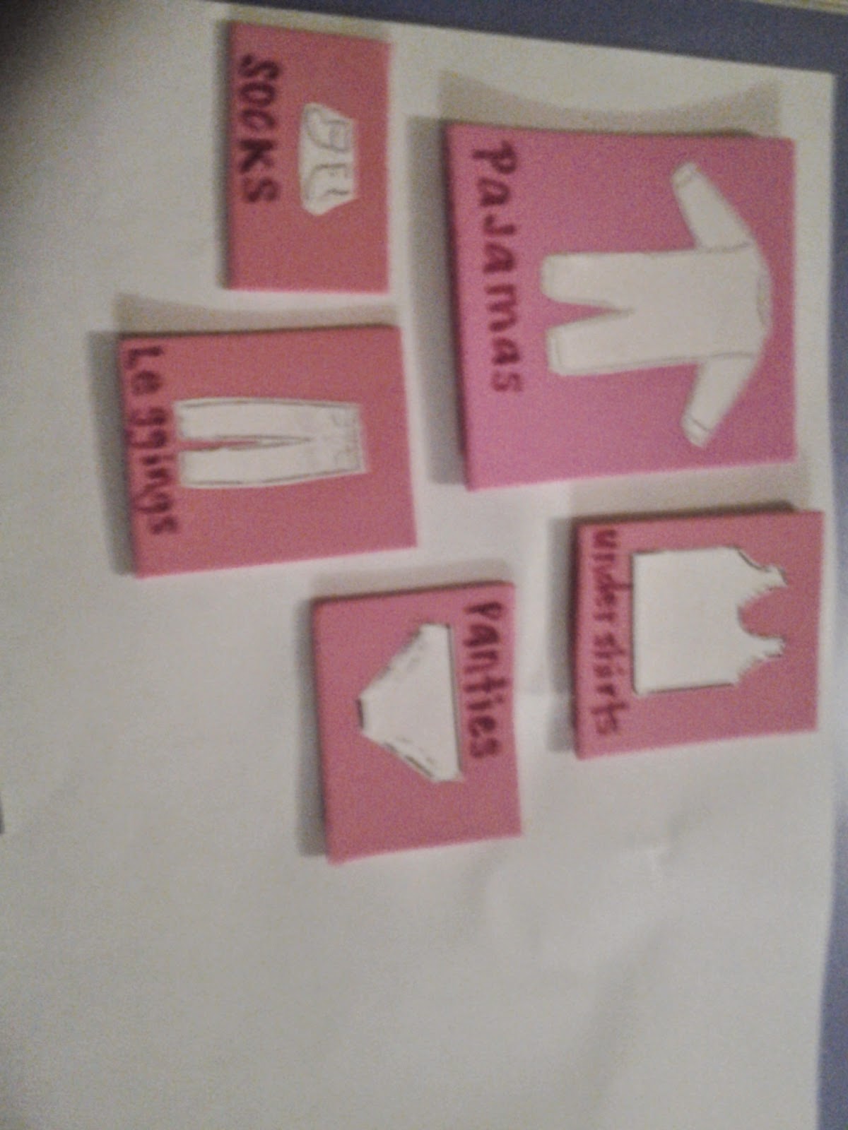 I searched for basic clothing clip art for the pictures. Since we use color coding for labeling everything, I just needed black and white pictures to put on the colored squares. I got some foam sheets to use as the base, as they were inexpensive but seemed durable enough to handle our closet.