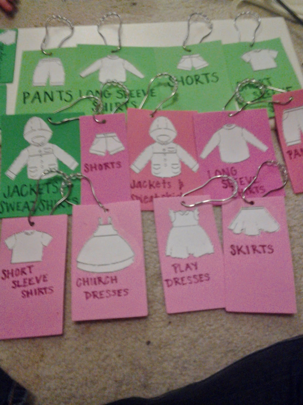 I used two packs of shower curtain hooks from the dollar store to hang them all up. This allowed for easy movement of the dividers and a small enough hook to fit on my rod. The kids loved them so much, I made some without hooks to label their drawers.