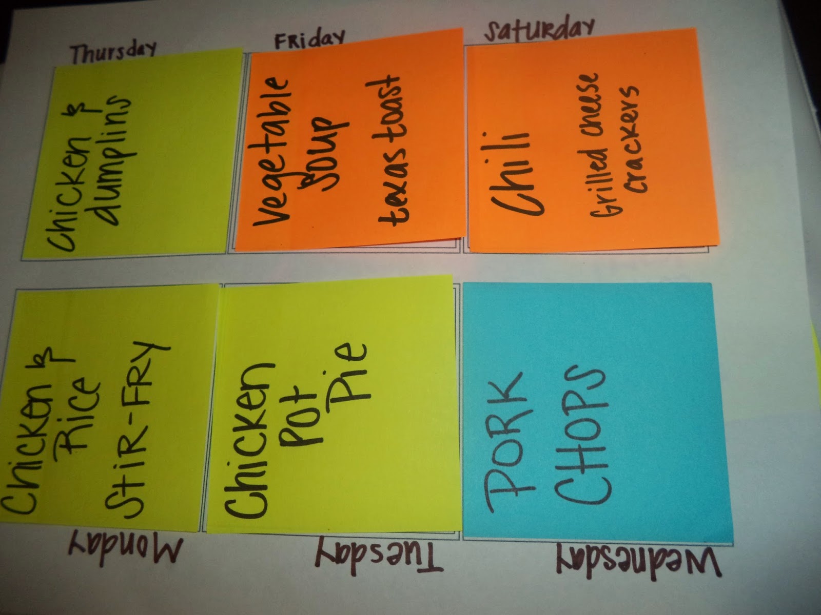 Now on to the planning! I had to consider our weekly schedules- church on Wednesday nights, soccer on Saturdays, etc. I picked out crockpot meals or quick-cooking meals for the busy nights. I saved the meals that required more prep work or cooking time for the days I knew I’d be home. I also tried to group together meals that required the same basic prepping, such as cooking and shredding chicken. This allows me to only have to do it all once, and the prep work is done. See my post on prepping meals here. I continued picking time-appropriate meals until my calendar was full. I saved a couple “swap meals” on Post-It’s in case I needed to swap out a meal if plans changed. My go-to swap meals are spaghetti, sandwiches, quick soups or an easy casserole. These are great when I am too busy or sick to cook my planned meals, and my 10 year old can help out more.